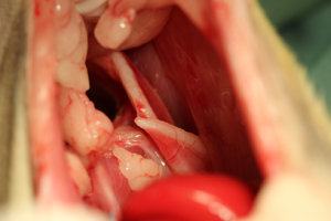 早急に手術により整復したほうが助かる可能性が高く、飼い主様もすぐに助けて欲しいとのことで、横隔膜ヘルニア整復手術を行いました。