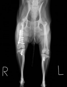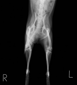 主訴:3ヶ月前から右後肢を着地しないで上げるようになっており、近医で痛み止めやサプリメントを処方されましたが、最近反対側の左後肢も足を曲げたまま歩けなくなったとのことで近医からのご紹介で来院されました。来院時、両後足とも屈曲したまま歩行できす、足を伸ばすこともできない状態でした。レントゲン検査にて左右とも膝蓋骨が内方に脱臼し、元に戻らない状態の上、大腿骨と脛骨が重度に変形していました。