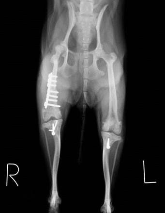 左右とも膝蓋骨の内方脱臼および大腿骨、脛骨の変形が認められます。 まだ子犬で、今のままではこの状態のままずっと歩けなくなることは間違いないと判断し、飼い主様とご相談し、両側膝蓋骨内方脱臼整復手術および、変形が強い右の大腿骨矯正骨きり手術を行いました。