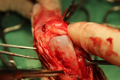 膝蓋骨が上に乗る滑車溝にまったく溝がなく、つるつるの状態でした。これでは膝蓋骨は脱臼してしまいます。