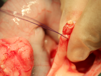猫の尿管は正常でも2〜3mmしかない非常に細い管なので、尿管結石を摘出したところをそのまま縫合すると術後狭窄の原因となり再手術のリスクが高くなります。幸いこの猫ちゃんは結石の場所が膀胱に近い箇所での尿管閉塞だったので、結石摘出後に左右尿管を膀胱の違う箇所につなぎ変える尿管転移植手術を行いました。