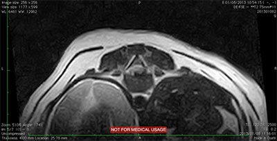 主訴:一昨日から右後足の動きがおかしく、昨日から両後足が全く動かなくなったとのことで来院されました。 診察時も両後足完全麻痺で、さらに大変なことに足の小指を刺激して痛みがあるがどうかを確認する深部痛覚が消失しており、早く治療しないと一生歩けなくなるかもしれない状態でした。飼い主様とご相談して、まずMRI検査にて脊髄の状態を確認後、手術可能であれば手術を行うことで治療をすすめました。