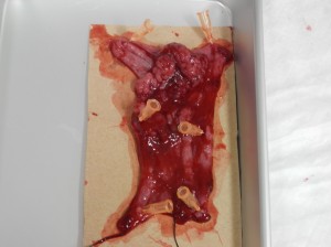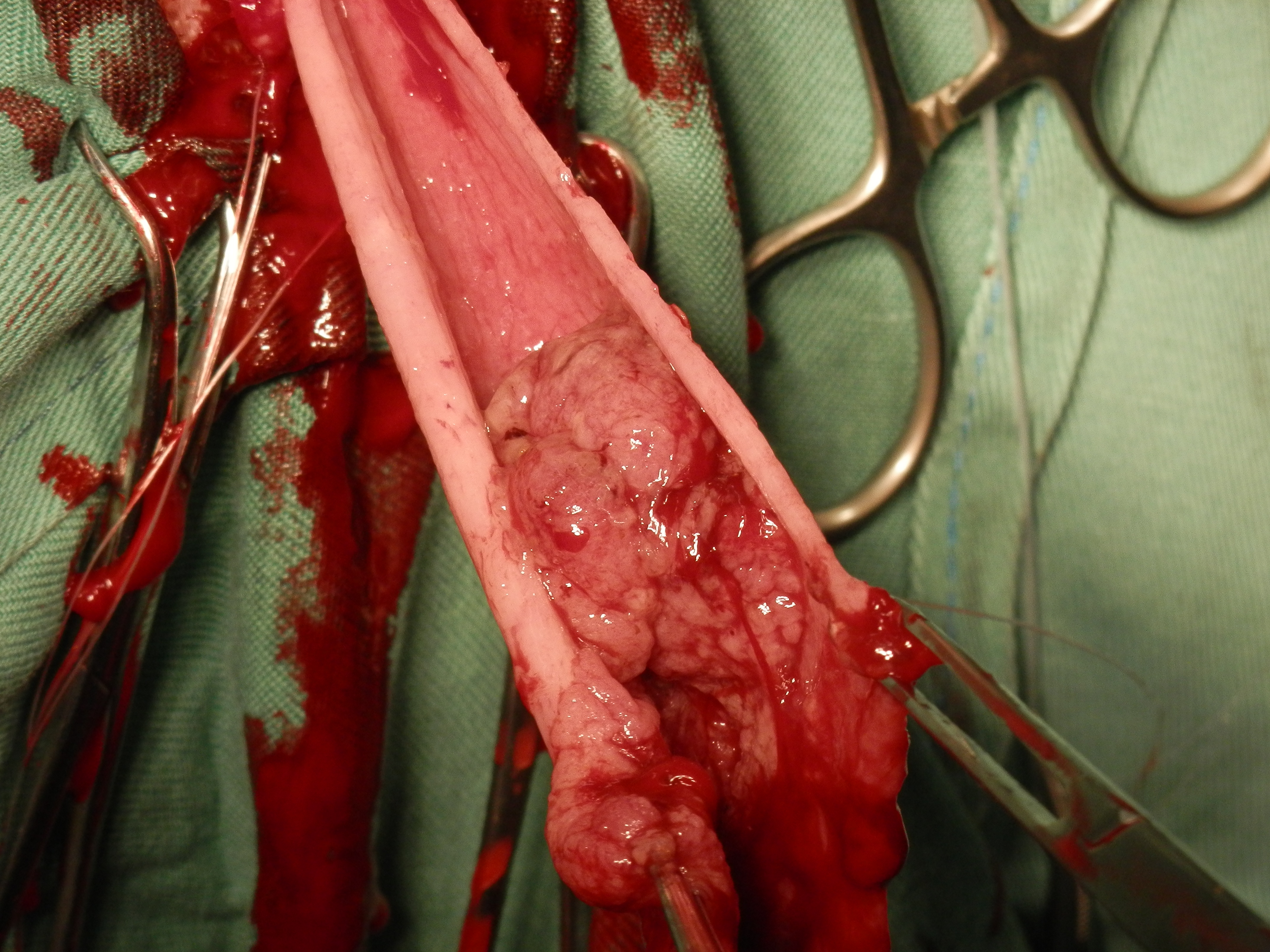 主訴:近隣の動物病院からのご紹介症例で、2週前から排便ポーズをとっても便がでない状態になり、直腸検査にて直腸に腫瘤が触知されため当病院に受診されました。レントゲン検査、大腸内視鏡検査にて、直腸領域に多発性の腫瘍が認められました。